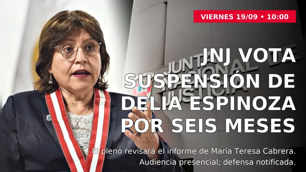 La Junta Nacional de Justicia (JNJ) evaluará este viernes 19 de septiembre, a las 10:00 a. m., en Lima, el pedido de suspensión por seis meses contra Delia Espinoza, fiscal suprema y fiscal de la Nación. El análisis se realizará sobre la base del informe de la vicepresidenta de la JNJ, María Teresa Cabrera, que atribuye a Espinoza falta grave por presunto incumplimiento del artículo 33 de la Ley de Carrera Fiscal, al no acatar una resolución que disponía reponer a Patricia Benavides en el Ministerio Público.